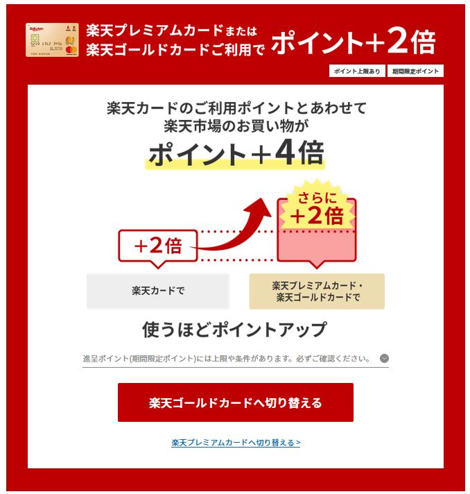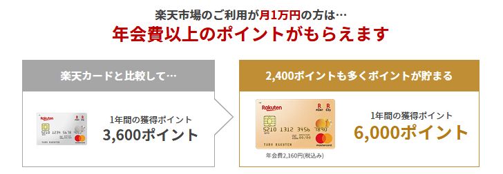 つまり、年間108,000円以上買い物するなら楽天ゴールドカードに切り替えた方がお得です。