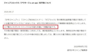 2020/8/30追記 こんにちは。思考停止三郎です。 ジャンプ公式アプリでアクタージュ電子版が無期限配信停止されました。 既購入者は配信停止後も閲覧できますので安心してください。 他の電子書籍サイトでも順次同じ措置がされるようなので配信停...