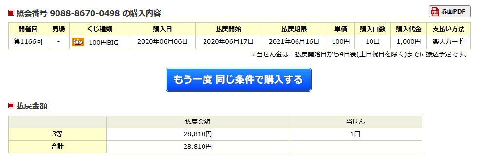 第1166回100円BIG(2020年6月13~14日)でなんと3等が当選しました!