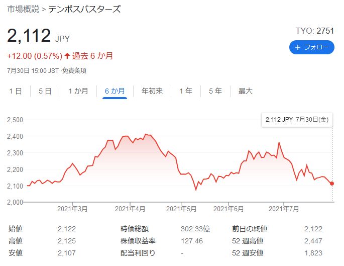 テンポスホールディングス(2751)の株価