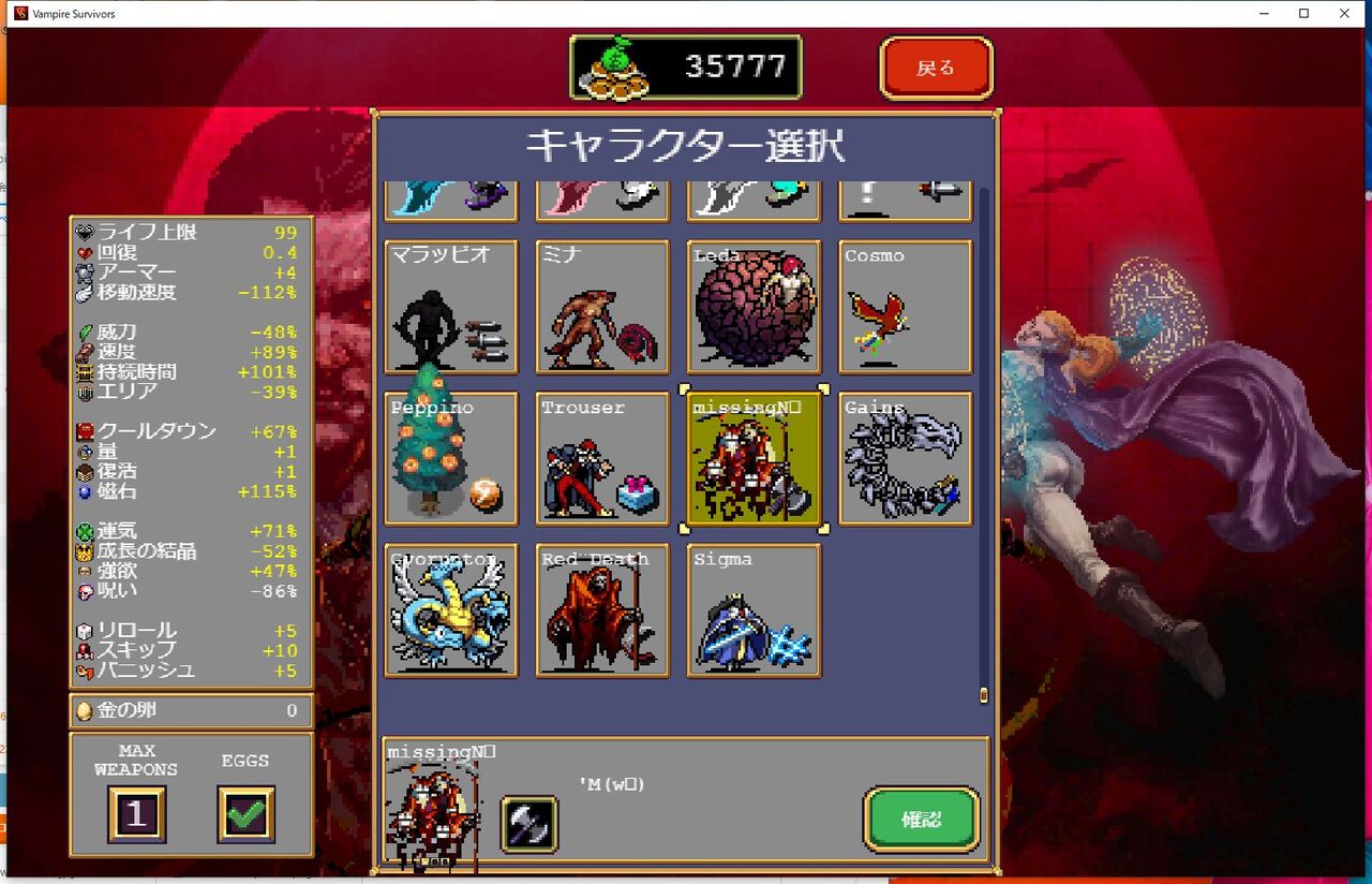 【緑の地】隠しキャラ「missingNO(ミッシングナンバー)」解放方法【ヴァンパイアサバイバーズ】