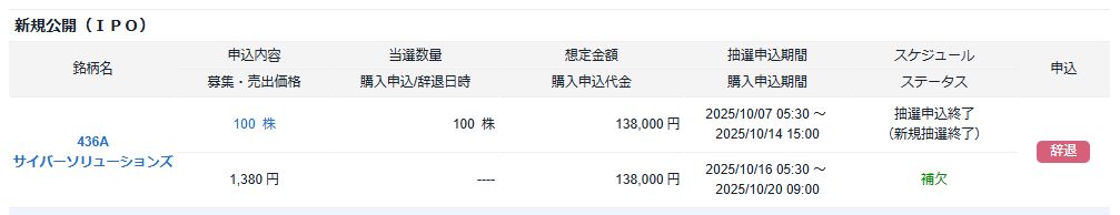 2025/10/15:大和コネクト証券で補欠当選しました!