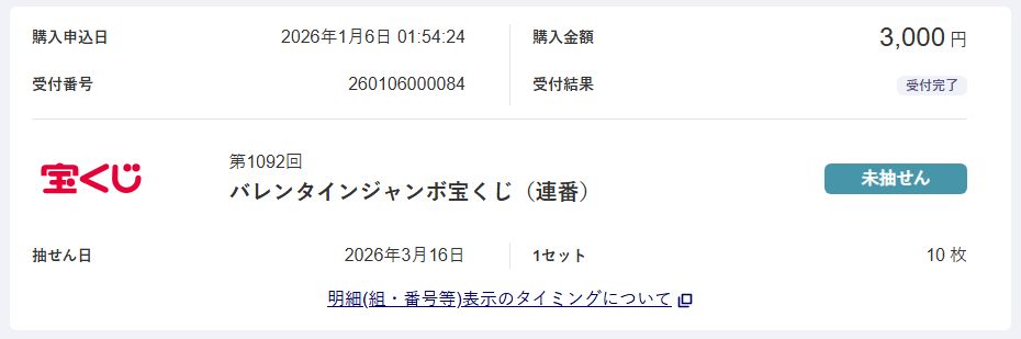 自分は2025/10/01にサッカーくじ公式サイトで購入した第1574回BIGで2等当せんしました。