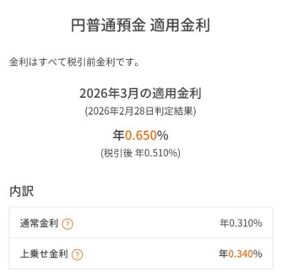 2026年3月1日現在、auじぶん銀行の円普通預金の適用金利は年0.31%なので合計0.65%になります。
