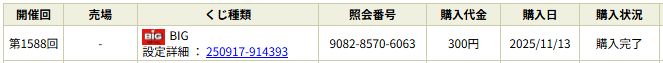 2025/10/01にサッカーくじ公式サイトで購入した第1574回BIGで2等当せんしました。