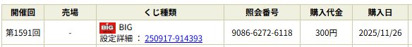 【第1591回BIG】くじ結果と1等くじの判定