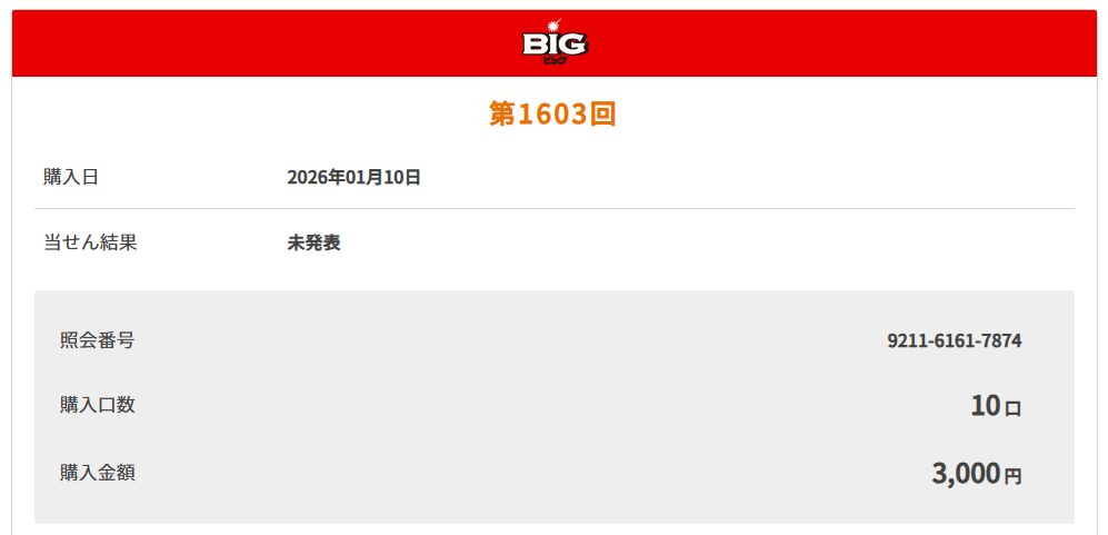 2025/10/01にサッカーくじ公式サイトで購入した第1574回BIGで2等当せんしました。