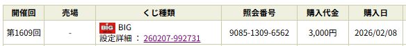 2025/10/01にサッカーくじ公式サイトで購入した第1574回BIGで2等当せんしました。
