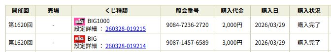 今回、高額キャリー継続中の1620回BIGを購入してみました。