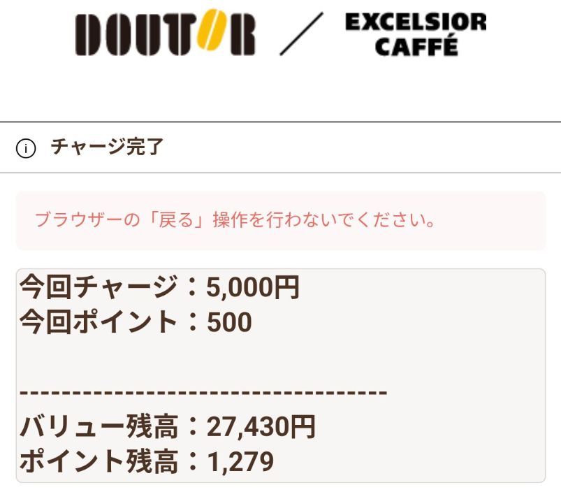 ドトールバリューカードにチャージできる金額は3万円が上限となります。
