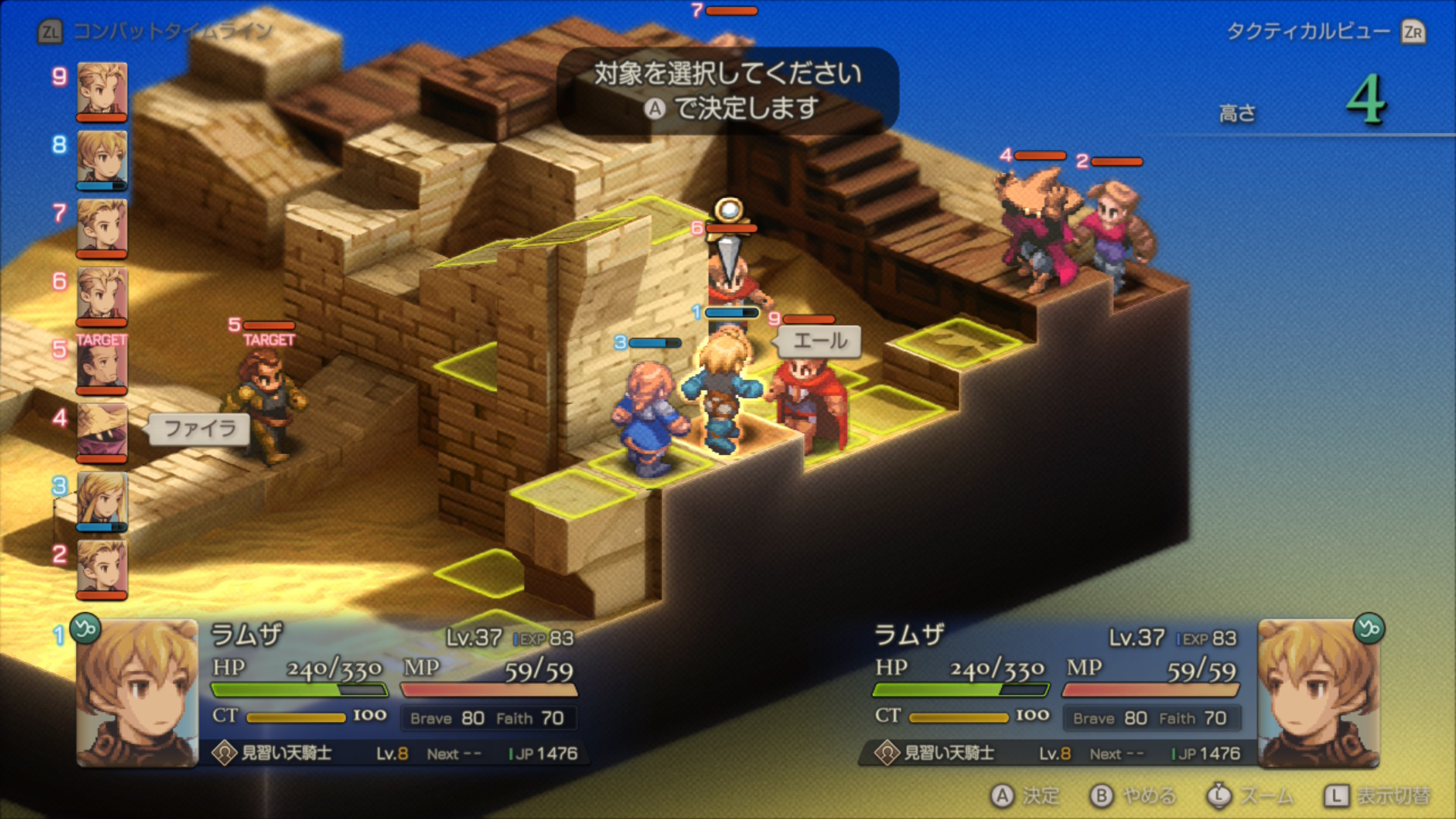 ラムザは上の画像の位置へ移動しながら「エール(さけぶでもOK)」連打、アグリアスも定位置へ移動。