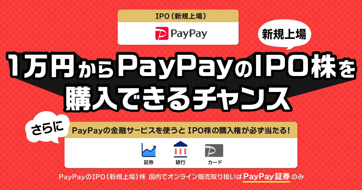PayPay新規上場株式(IPO) | PayPay証券1万円からPayPayのIPO(新規上場)株式を購入できるチャンス!国内でオンライン販売の取り扱いはPayPay証券のみ ※条件・上限あり